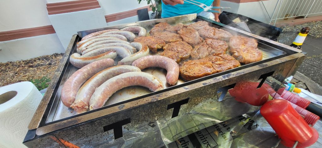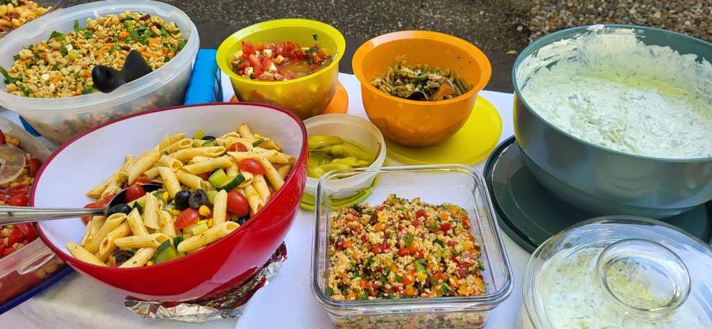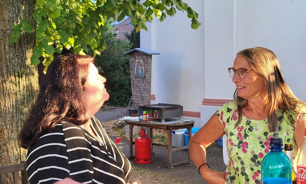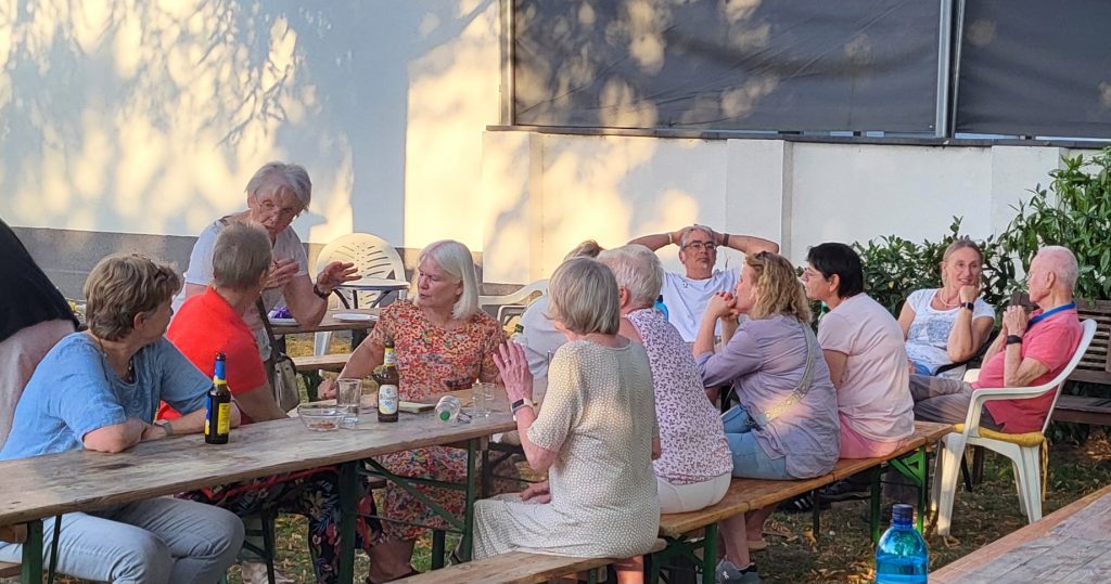 Im Grünen, hinter der katholischen Kirche von Pfungstadt, feierten wir vom Hospizverein Pfungstadt und nördliche Bergstraße am Abend des 4. Juli unser Sommerfest für die ehrenamtlichen Hospizbegleiter und Hospizbegleiterinnen. Schöner hätte das Wetter kaum sein können – warm, aber nicht zu heiß, und ein laues Lüftchen wehte. Für ein abwechslungsreiches Büfett hatten alle gemeinsam gesorgt, auch die Getränkeauswahl war groß. So war der passende Rahmen fürs ungezwungene, fröhliche Beisammensein gesteckt und alle genossen die Gemeinschaft und die Gespräche.